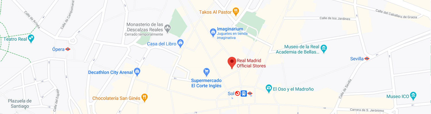 On Calle de El Carmen, in the centre of Madrid with an area of more than 200m2, Real Madrid has a store with the Club's official products. Due to its prime location, it forms part of the best-known tourist routes.