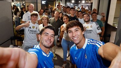 Brahim y Gonzalo protagonizaron un evento organizado por adidas en la Tienda Gran Vía con motivo del lanzamiento de la tercera equipación del Real Madrid para la temporada 2025/26 y de la colección Real Madrid Terrace Icons.