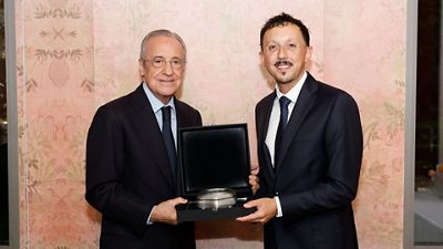 Florentino Pérez, presidente del Real Madrid, y Pablo Longoria, máximo mandatario del Olympique de Marsella, encabezaron las comitivas de ambos clubes en el encuentro oficial de directivas previo al partido que disputarán esta noche los dos equipos en el Bernabéu, correspondiente a la primera jornada de la Champions.