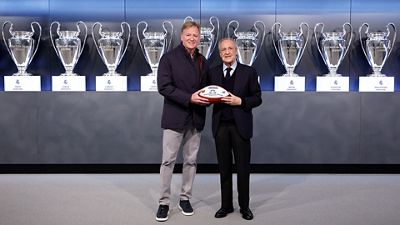 Le président Florentino Pérez a reçu Roger Goodell, commissionnaire de la NFL, dans la salle des réunions de la Ciudad Real Madrid à la veille d'un match historique de NFL au Bernabéu. Au cours de la cérémonie, un échange de cadeaux a eu lieu.
