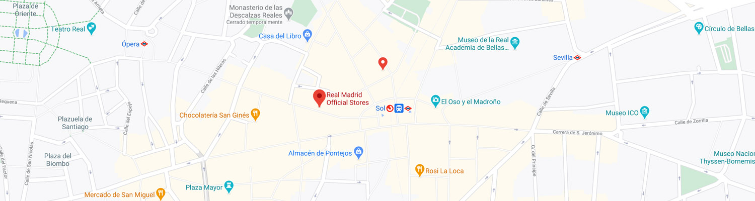 Située dans la rue centrale Arenal, proche de la Puerta del Sol, elle recrée, dans ses plus de 350m2 répartis sur deux étages, l'ambiance qui se vit au stade. Cette boutique officielle met à la disposition de tous nos suiveurs la possibilité d'acquérir n'importe lequel des produits officiels du Club.