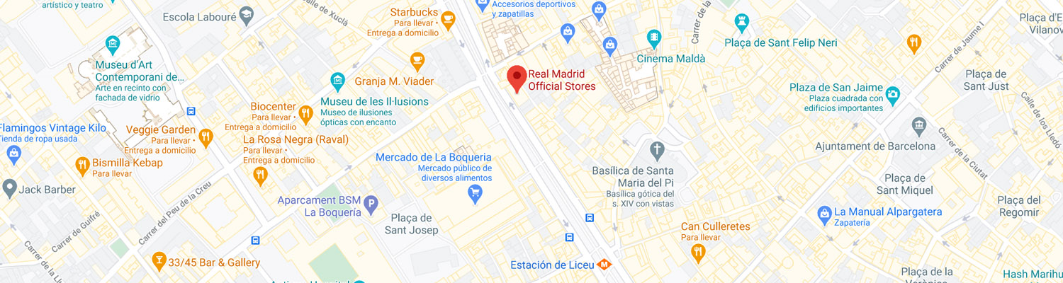 Em plenas Ramblas, uma das zonas mais turísticas da cidade, está localizada a primeira Loja Oficial do Real Madrid em Barcelona. Como prenda de boas-vindas, os nossos seguidores podem tirar uma fotografia com uma majestosa maqueta de ferro do Santiago Bernabéu, e uma vez dentro da loja, vai sentir que estão dentro do Estádio, no seus mais de 160 m2 divididos por dois andares. Adicionalmente, têm disponível toda a gama de produtos oficiais do Real Madrid.